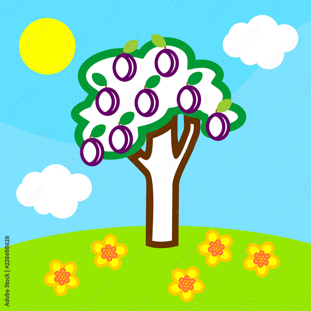 Summer landscape coloring book vector. Summer landscape ... sketch, summer landscape with a fence with sun and tree, coloring book, isolated object on white background, cartoon illustration, vector, eps Coloring book - Simple spring geometrical landscape with trees and a lot of flowers